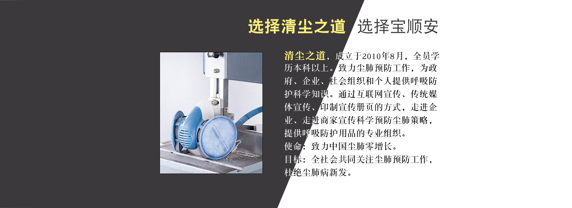清塵之道特種勞動防護用品有限公司成立于2010年,是一家集呼吸防護公益宣傳、提供呼吸防護解決方案、協助合作伙伴培訓、拓展市場、提升管理水平,為有需要的企業和從業人員提供寶順安品牌防塵、防油煙口罩,防毒面具為一體的公司。